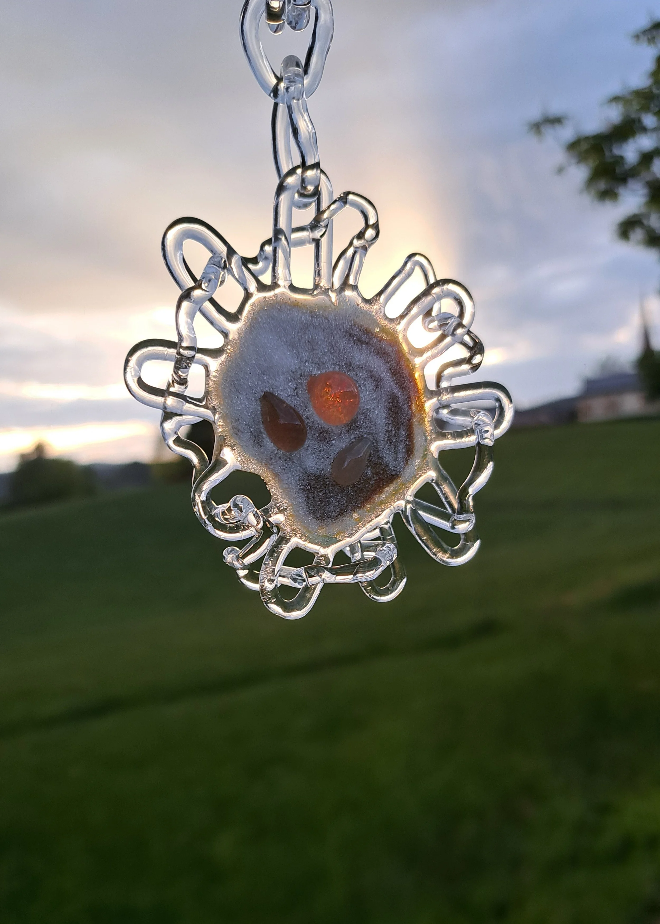 The pendant is a hybrid of high quality flameworking and fused borosilicate (laboratory) glass. The colour is achieved with silver oxide powders to reveal striking colours that change with the light.
