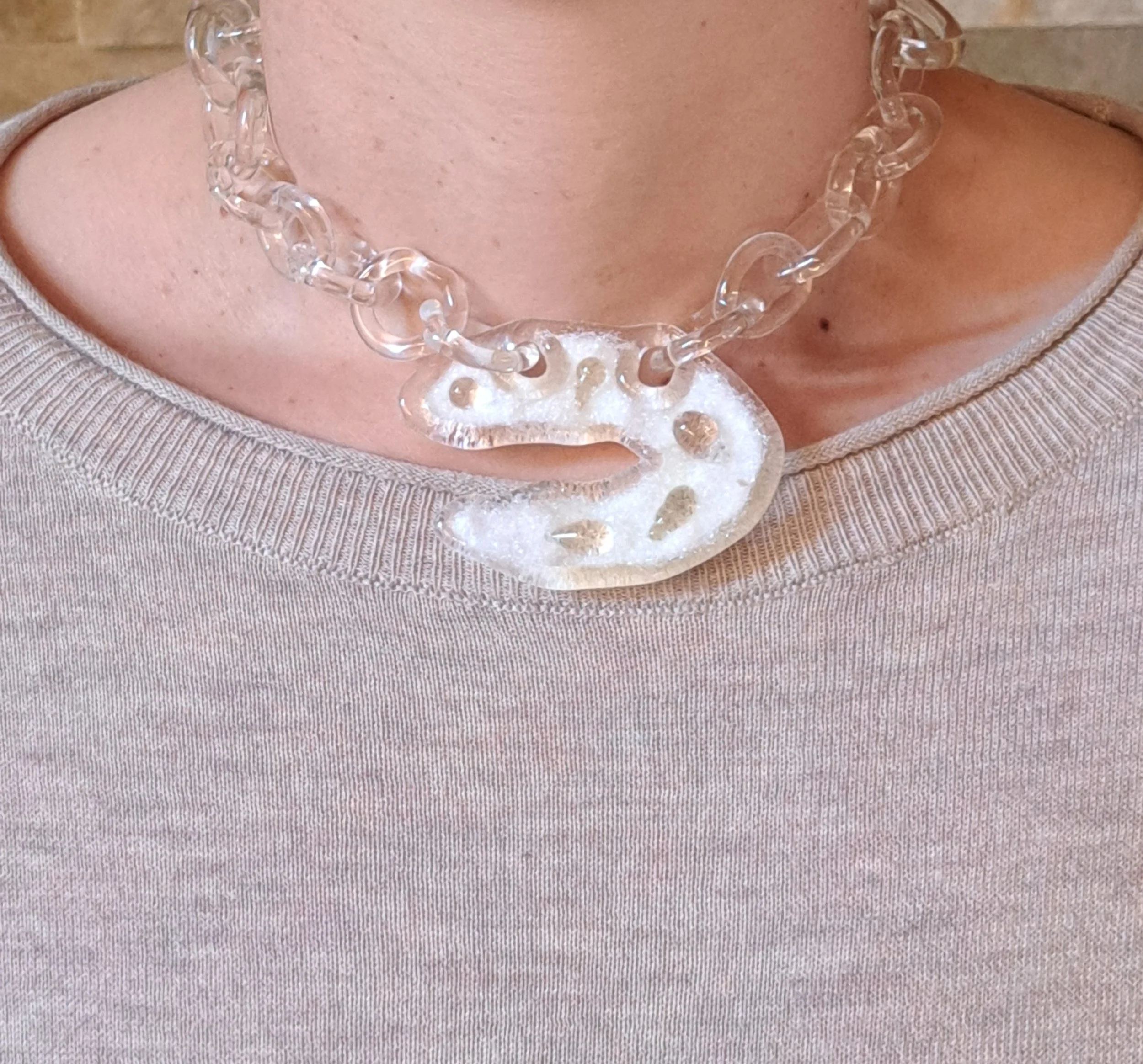 The pendant is a hybrid of high quality flameworked and fused borosilicate (laboratory) glass.
